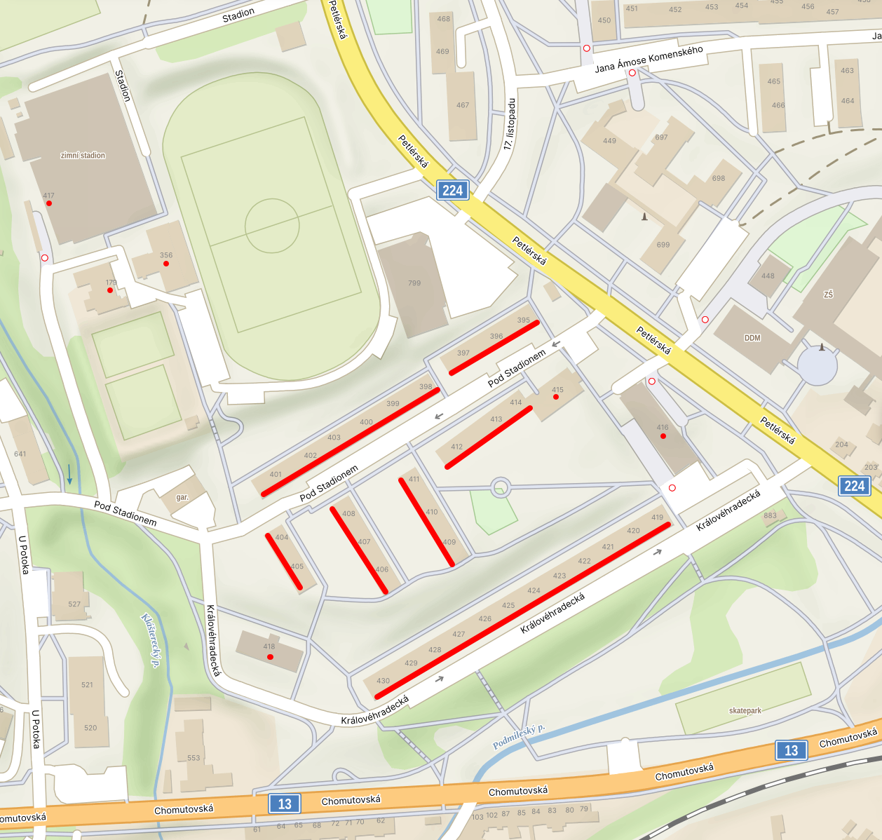 Jedná se o lokalitu ulic Pod Stadionem a Královéhradecká.